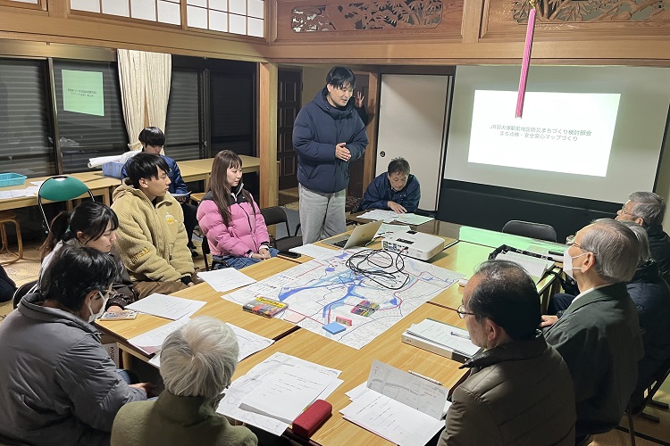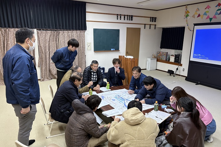 昨年度作成した「安全安心マップ」は、福岡県まちづくり専門家である本田正明氏(九州産業大学)および九州産業大学の学生の皆さまのご協力のもと、地域の方々と一緒にまちあるきやワークショップを行いながら作成しました。実際にまちを歩き、浸水が想定される区域や空き家の状況、危険箇所、水路の状態など、地域課題を地図に書き込み、共有しています。